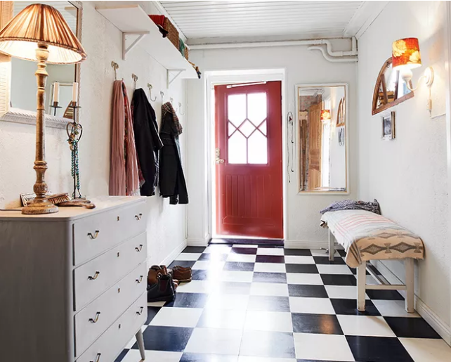 玄关地面用的黑白格子地砖,既从色彩上区分了玄关和室内,又比较耐脏。