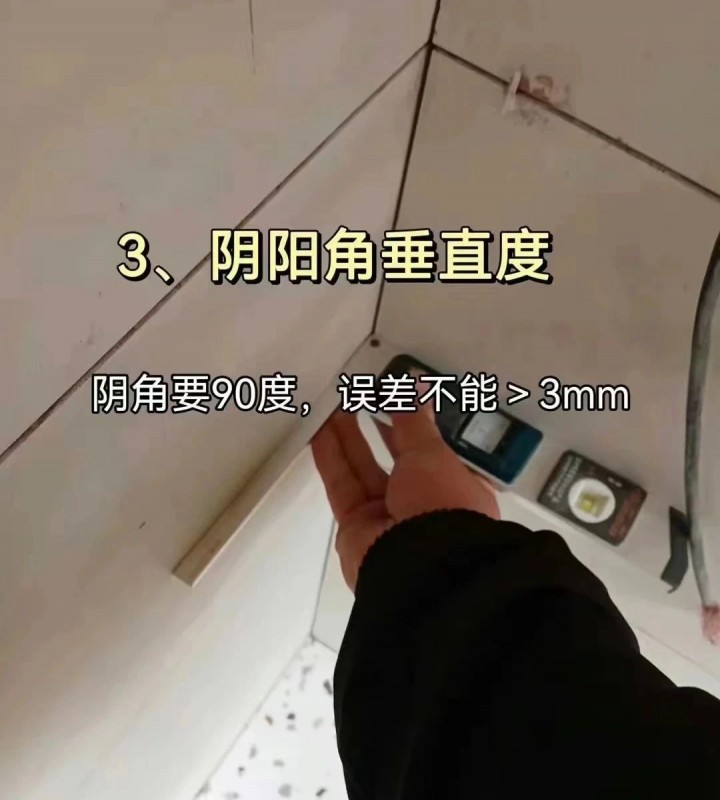 平整度:阴阳角的平整度是指墙面与地面或与其他墙面相交的地方是否平滑、无凹凸不平的现象。一般来说,阴阳角的平整度误差应控制在2mm以内。而且阴阳角的角度应保持在90度左右,误差不应超过2度。