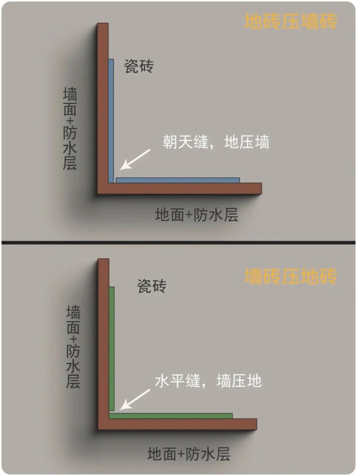 在卫生间装修的讨论中,“地压墙” 和 “墙压地” 常被贴上 “防水关键” 的标签,甚至有人将漏水问题直接归咎于工艺选择,但事实上,这两种工艺本质只是地砖与墙砖的铺贴顺序差异,与后期是否渗水没有直接关联。所谓 “地压墙”,是先贴墙砖再铺地砖,墙砖底部与地砖边缘形成垂直砖缝;“墙压地” 则先铺地砖再贴墙砖,形成水平砖缝。无论是垂直缝还是水平缝,本身并非防水屏障,瓷砖缝隙的密封性才是决定是否渗水的核心 —— 若砖缝未做有效密封,即便选 “地压墙”,水汽仍会渗入基层;若密封到位,“墙压地” 的水平缝也能阻挡渗透,将渗水风险归因于工艺选择,实则混淆了 “工艺形式” 与 “密封本质”。