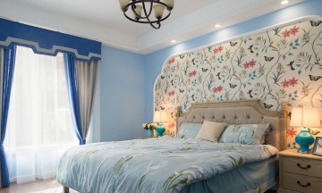蓝色天空欧式风格80平米二居室卧室背景墙装修效果图