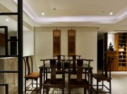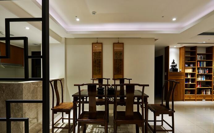玄关处以铁件为屏风,呈现中式特色设计,打造简洁利落的入门即视感。开放式的空间格局规划,让视线不受拘束,给人以宽敞的感觉。