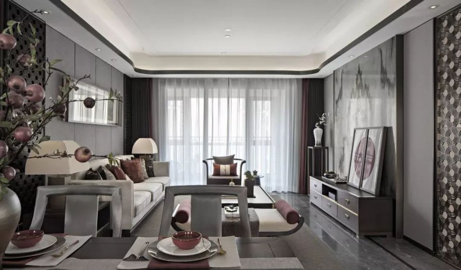 • 简洁雅致中式风格140平米三居室客厅背景墙装修效果图