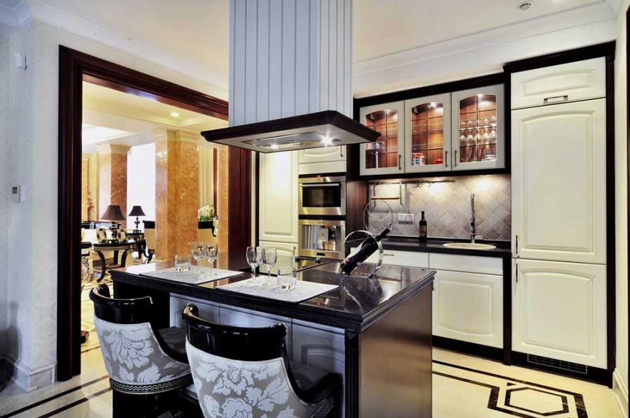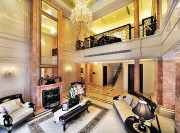 别墅客厅的高大是一个基本特征,装修好别墅客厅的背景墙就显得尤为重要,这里的背景墙非常连贯和高贵。客厅吊顶方方正正,吊顶的水晶吊灯尽显奢华富贵,把整个客厅都照亮了,波幔窗帘符合新古典风格的装饰。