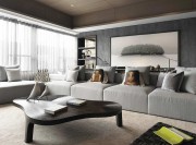 餐厅超个性的餐椅,给人女王般的享受。地板采用瓷砖设计明亮雅致与之形成对比的是木质的吊灯,显得柔美。客厅灰色的布艺沙发看起来休闲舒适,创意的木质茶几是整个空间最出彩的地方,独特的造型带着不对称的美感。
