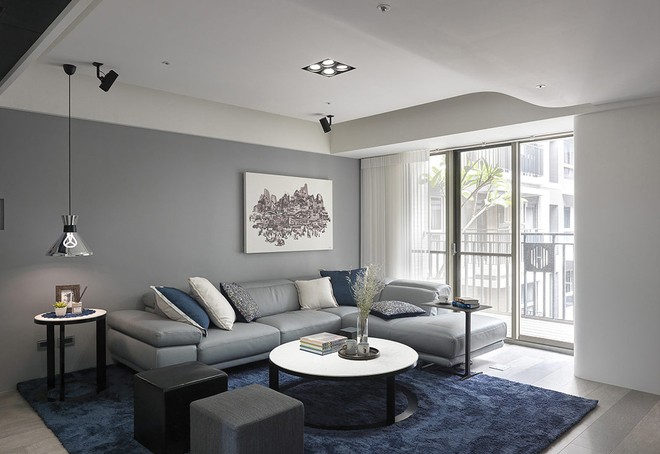 在黑白灰的整体基调下,辅以深蓝色地毯增加色彩丰富性,营造出别样韵味。圆形茶几在整个直线型设计中,格外显得细腻和柔美。过道的墙边设置固定式置物架,可以放一尊艺术性极强的石头做装饰。